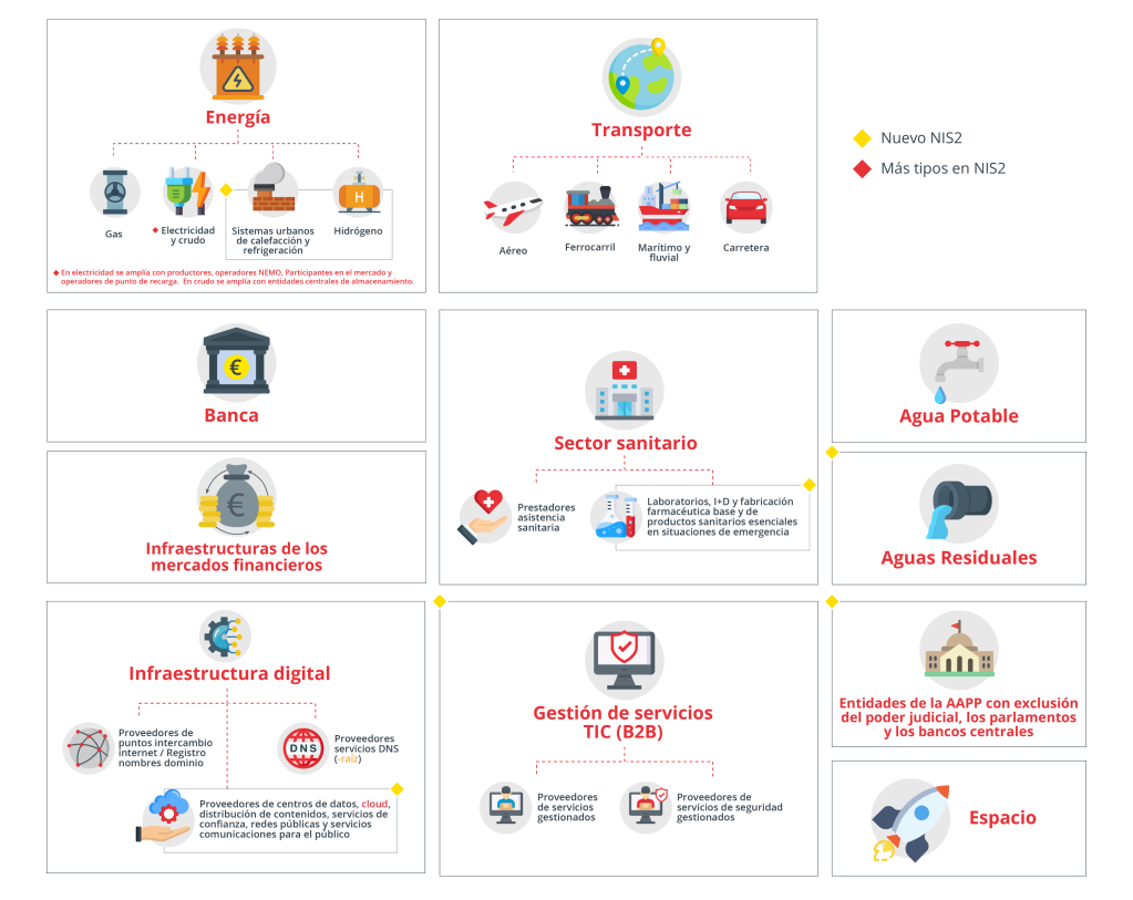 La directiva NIS2 aplica a un mayor número de entidades e incluye nuevos sectores, subsectores y tipos de actividades, que no están en el ámbito de la actual Directiva NIS2 (transpuesta a la legislación nacional en el Real Decreto-ley 12/2018, de 7 de septiembre, de seguridad de las redes y sistemas de información).